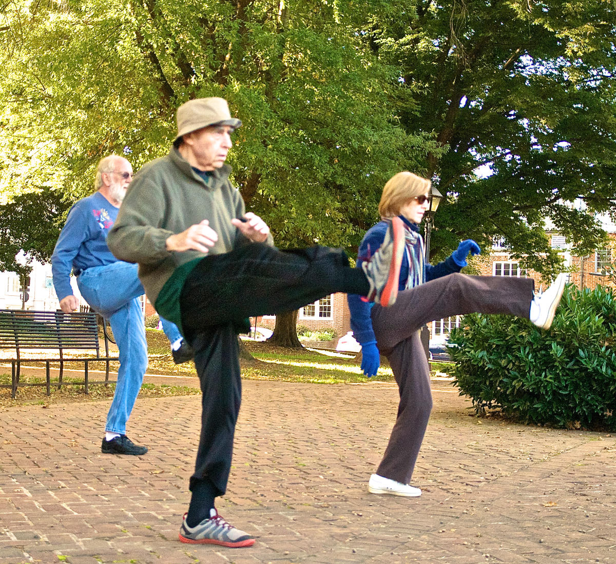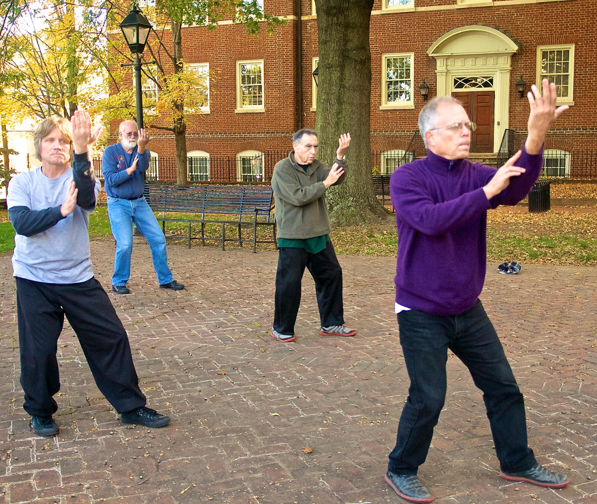 I am one of those people who you might see in a group doing T’ai Chi in the Courthouse park every Saturday morning. I didn’t have the courage to do that until I had learned the entire form, because I could not have mimicked others in the group with my poor eyesight. Even then, I was afraid I wouldn’t see enough to stay in pace with the others. “Unison” is the word here. So Master Hiromi put me smack dab in the middle so I would always be facing a nearby colleague. I can get enough visual cues that way, most of the time.